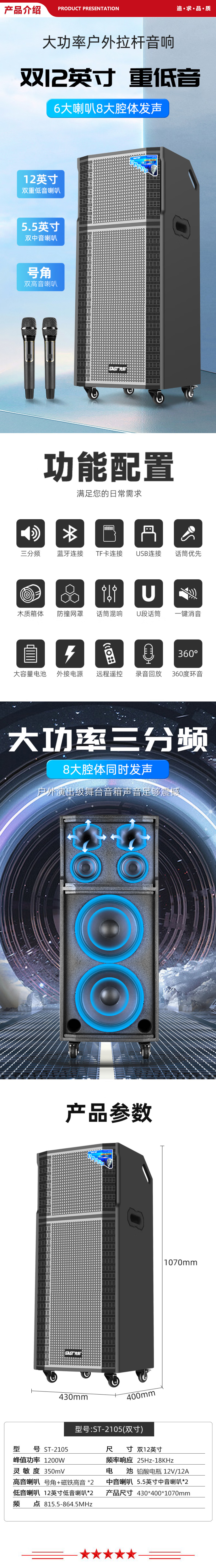 先科 SAST ST-2105 12英寸双户外音箱 舞台会议演出广场舞专业音响 无线蓝牙重低音拉杆扩音器配双话筒