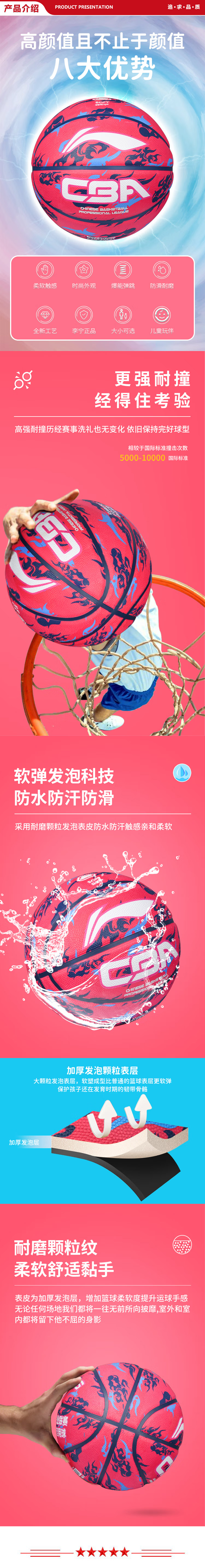 李宁 LI-NING LBQK615-3 联赛经典橡胶玫红篮球 室内外儿童成人5号橡胶材质蓝球