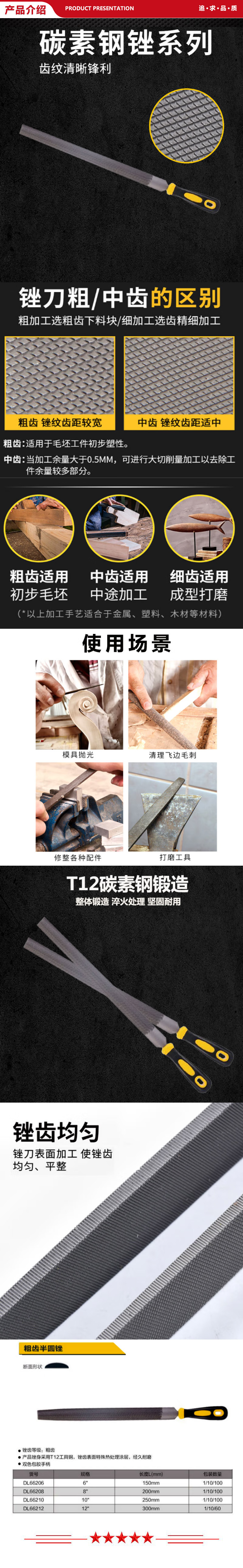 得力 deli DL66206 中齿粗齿半圆锉搓刀金属细扁挫打磨戳刀扁锉刀钳工粗齿半圆锉6英寸
