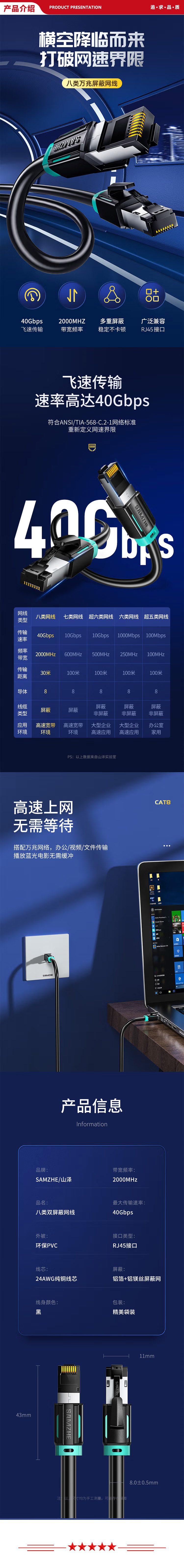 山泽 JC8100H 八类万兆网线 电竞级网络成品跳线CAT8纯铜双屏蔽8芯双绞电脑宽带连接黑色10米