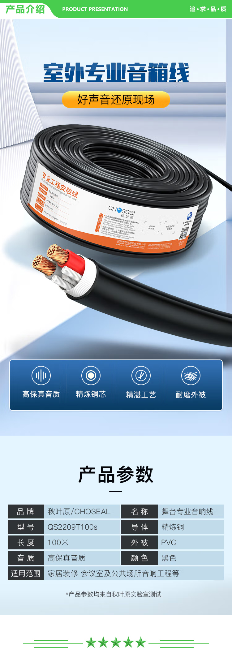 秋叶原 CHOSEAL QS2209T100 音频线 音响线 大功率音响线 室内外舞台专业音箱喇叭线2.5平方 100米 2.jpg