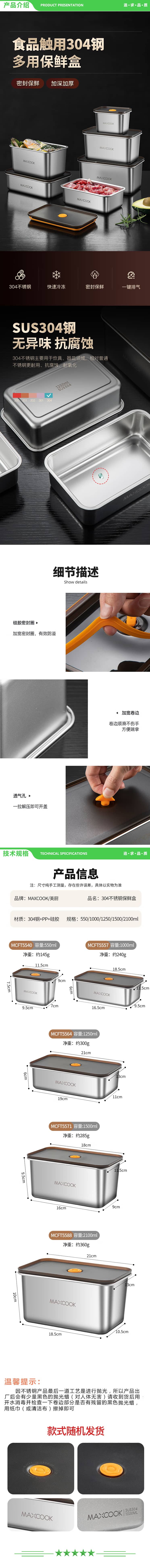美厨 maxcook MCFT5557 304不锈钢保鲜盒 带盖饭盒便当盒冰箱密封储物盒1000ml 2.jpg