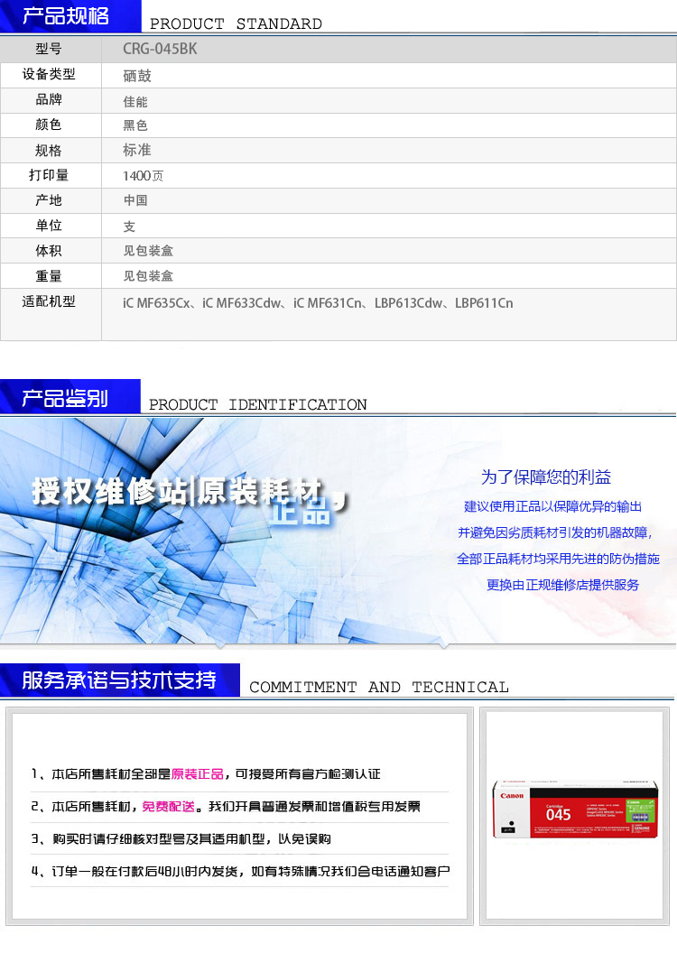 佳能 Canon CRG 045 BK 黑色碳粉盒 (适用于iC MF635Cx、iC MF633Cdw、iC MF631Cn、LBP613Cdw、LBP611Cn)