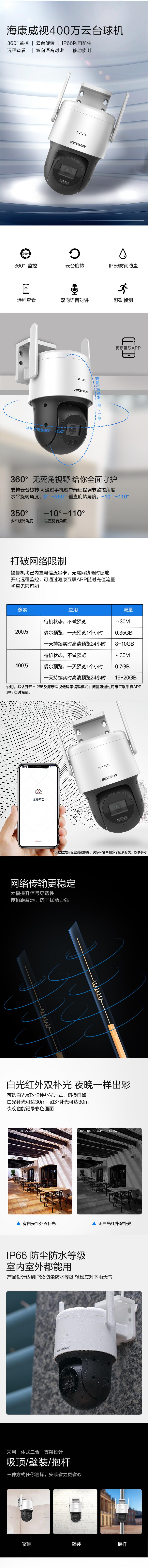 海康威视 HIKVISION 监控摄像头 室外防水远程监控400万云台旋转球机 64G内存卡