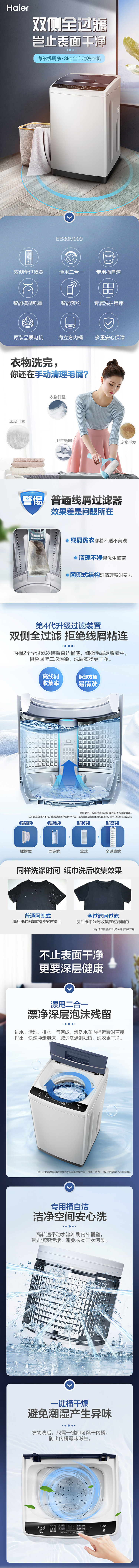 海尔 Haier EB80M009 家用全自动波轮洗衣机 8kg 漂甩二合一 四重洗护