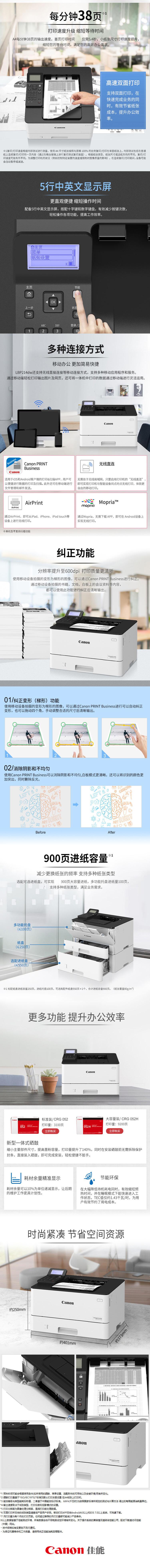 佳能 Canon LBP214dw A4黑白 激光打印机 38页