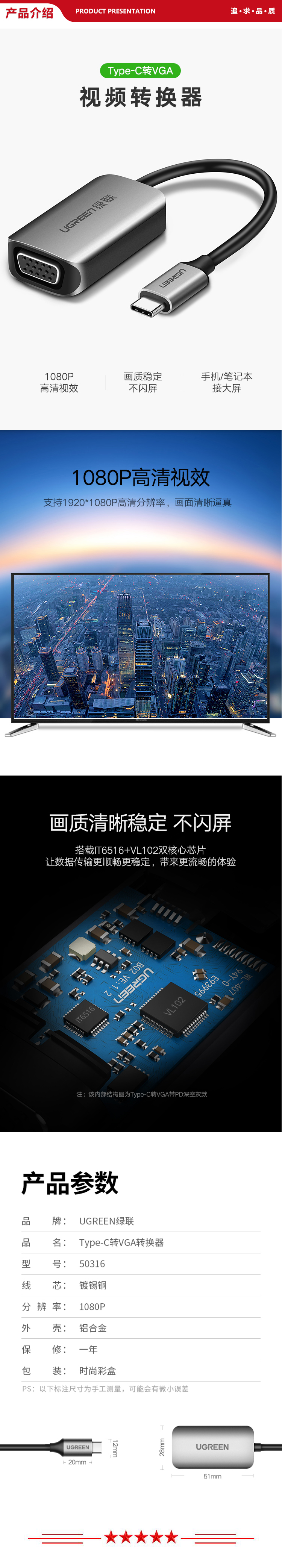 绿联 UGREEN 50316 Type-C转VGA转换器 通用USB-C转VGA手转接头拓展坞