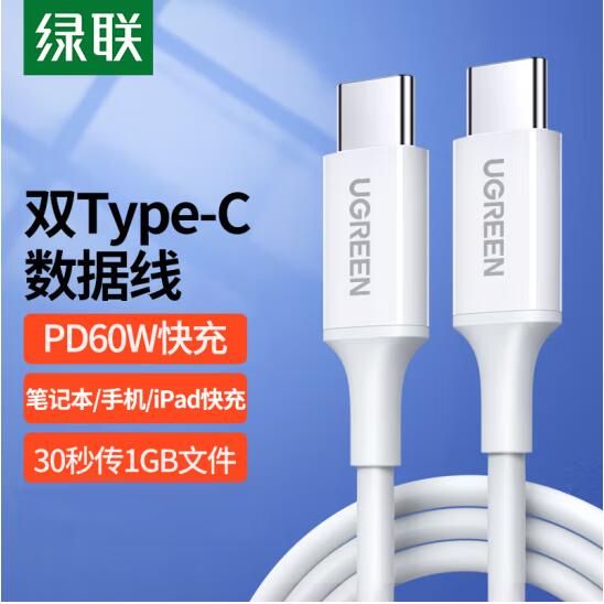 绿联 UGREEN US264 双Type-C数据线 PD60W快充线 车载充电线通用 1米